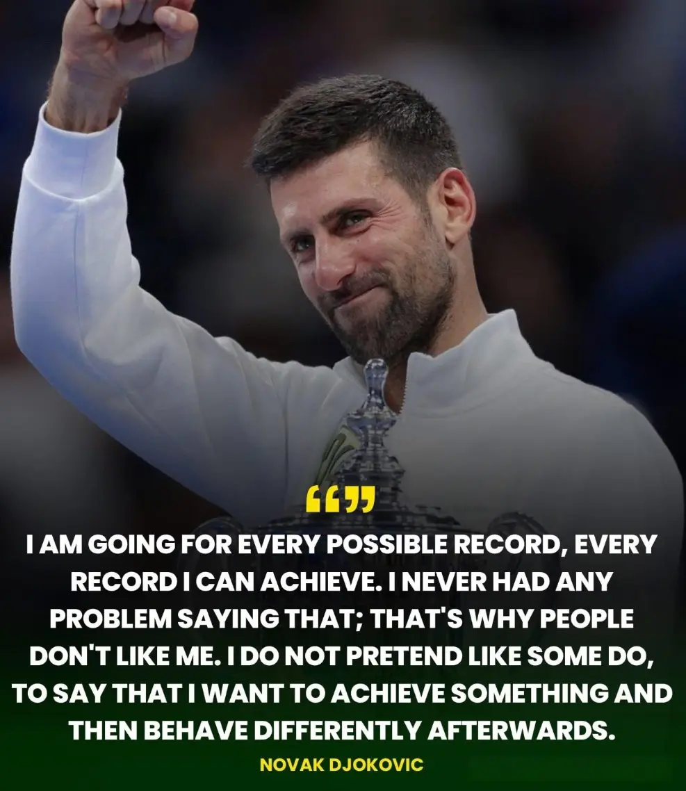 “我要冲击所有可能的纪录,所有我能达成的纪录,我从来不觉得说这些有什么问题,这就是为什么人们不喜欢我。”德约坦言,自己向来不擅于伪装,心里怎么想就直接说出来,就算别人因此不喜欢自己,也会清楚地对外表达自己内心的所思所想。